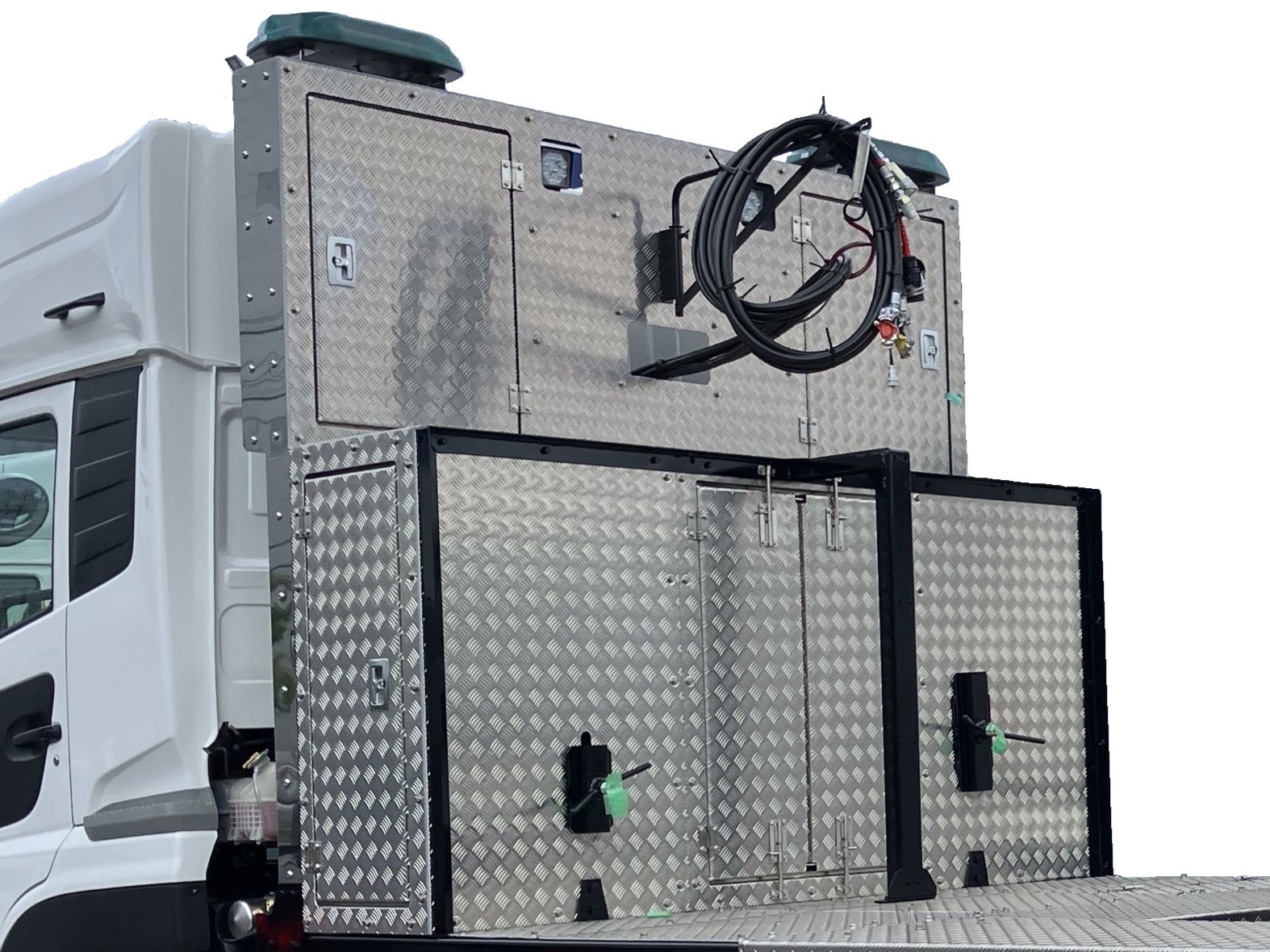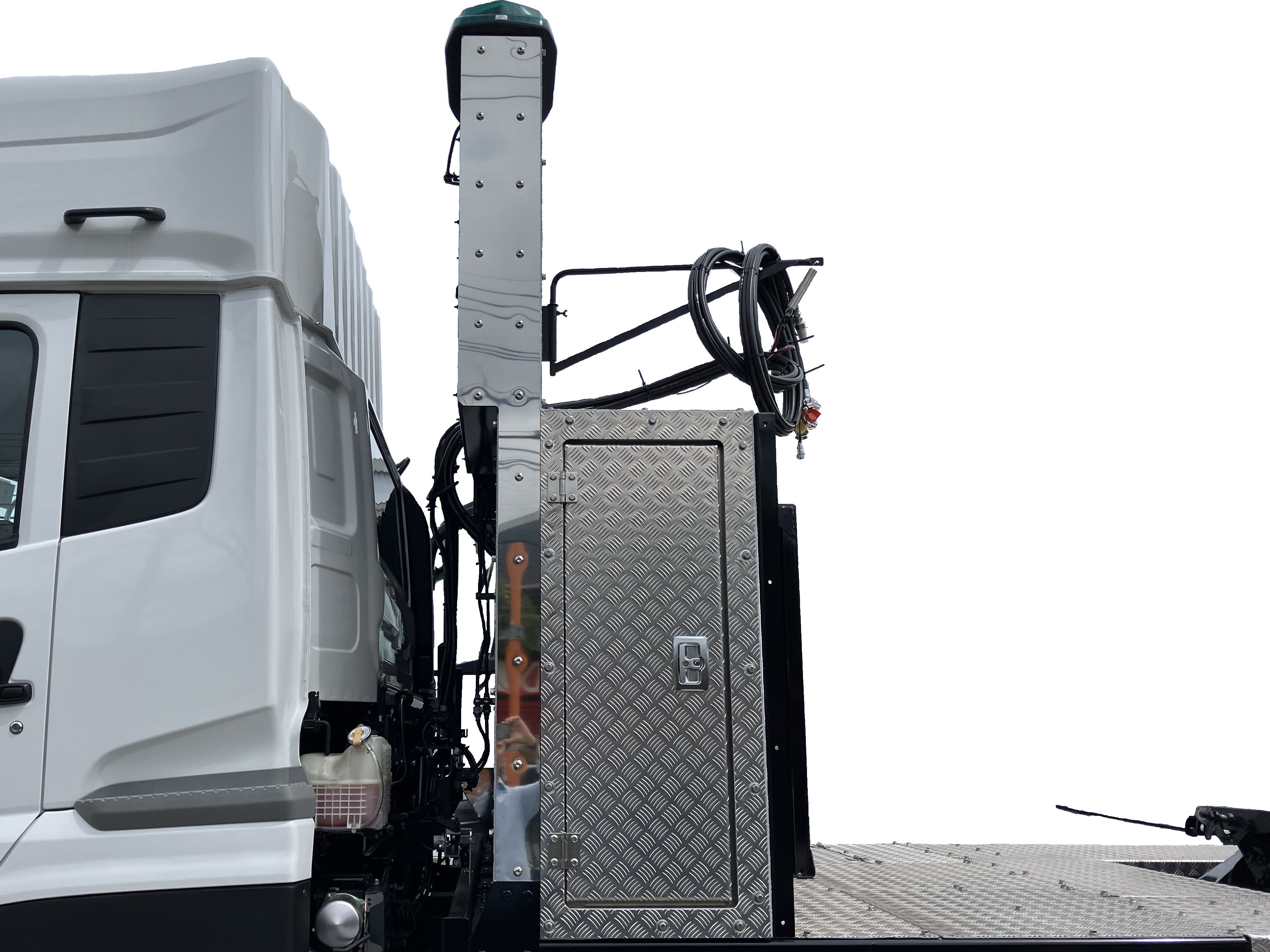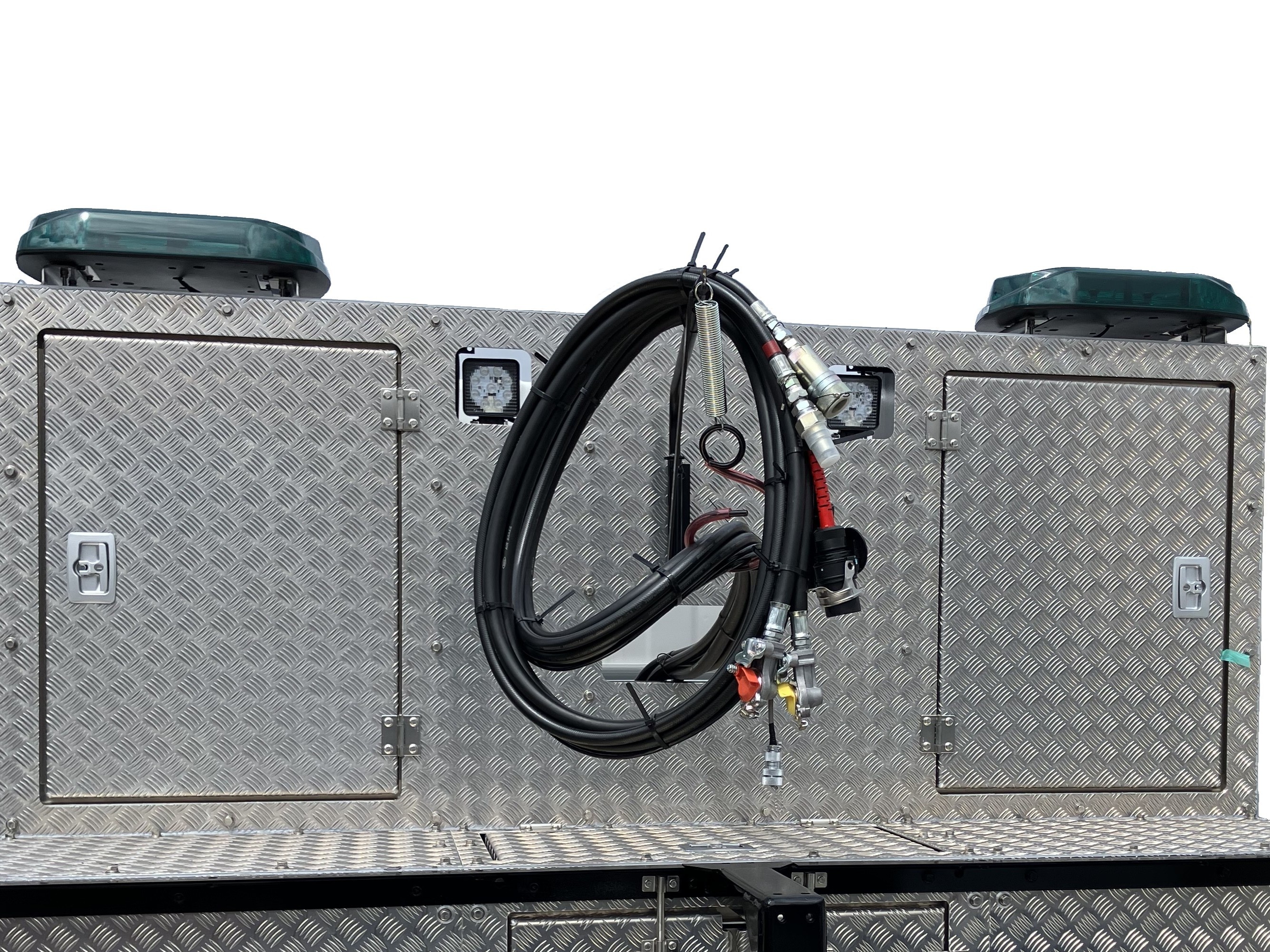 トレーラ用の油圧装置は、工具箱中央部に収納されています。工具箱内に専用スペースを設けることで、外部への露出を避け、装置の保護と美観を高める設計となっています。