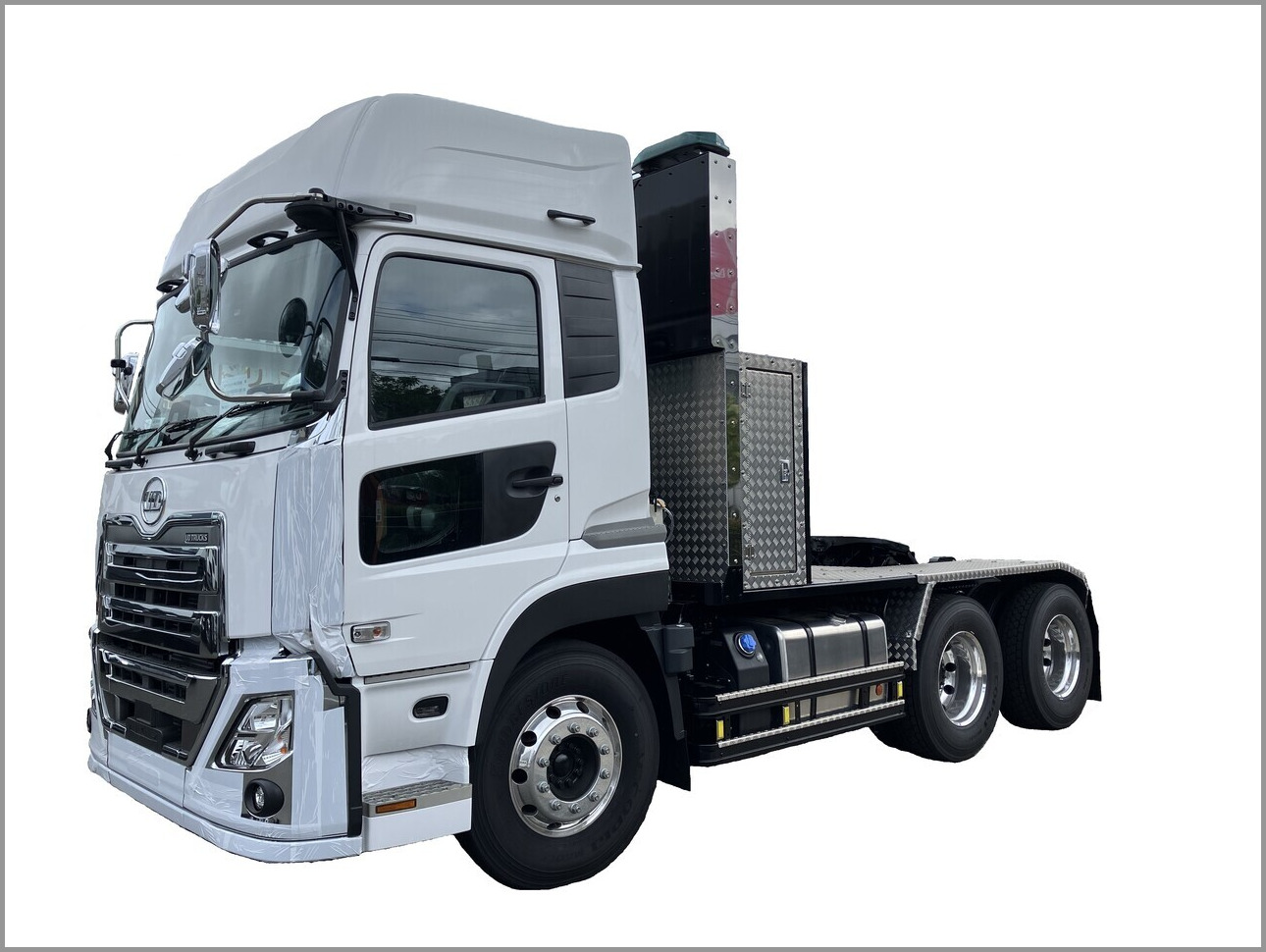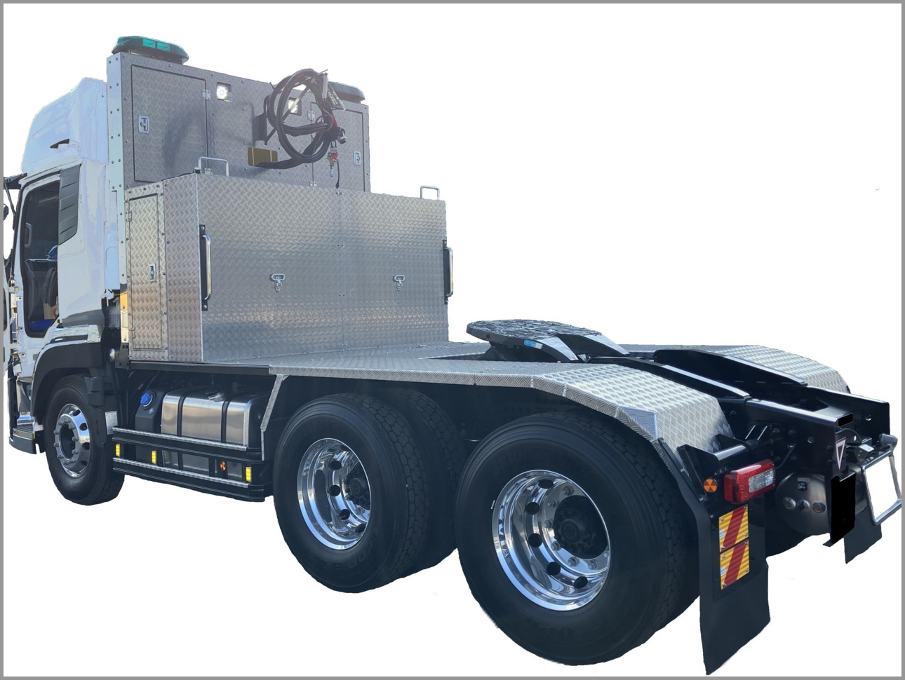 本トラクタは、作業効率と収納力の両立を目的に、工具箱の設計に重点を置いた架装を施しています。工具箱側面に扉を設け、内部スペースを有効に活用することで、中央部にはトレーラ用の油圧装置を収納し、整備性と保護性を兼ね備えた設計としています。さらに、工具箱後面にはスペアタイヤキャリアを設置し、トラクタヘッド用とトレーラ用の異なるサイズのタイヤを収納可能な構造としています。その上からアルミ縞板製のカバーを取り付けることで、タイヤの保護と美観を両立。限られたスペースの中で、収納機能と整備性、安全性を高いレベルで融合させた架装となっています。