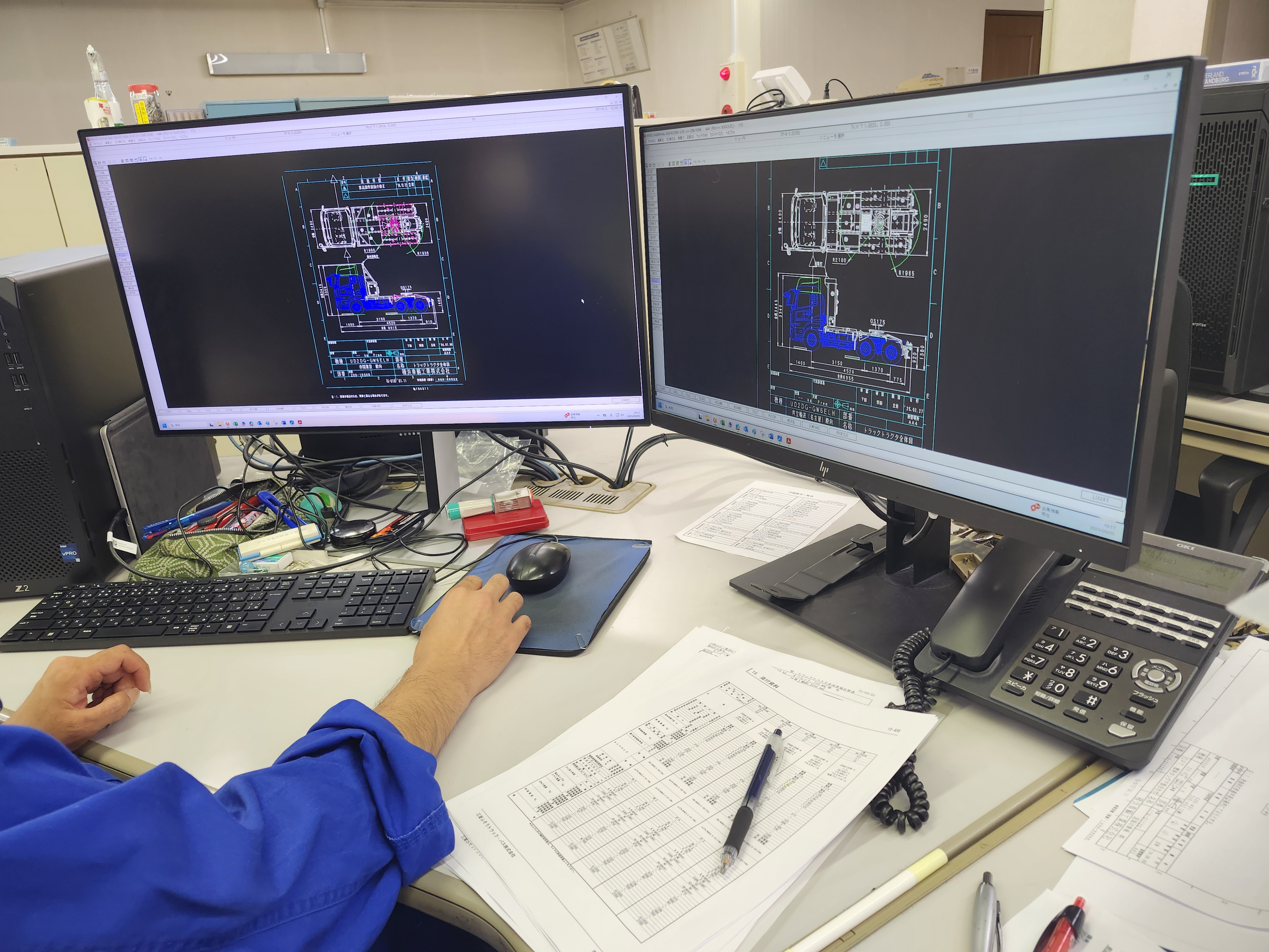 製造部門が部品の取り付けや溶接などの架装作業を行い、