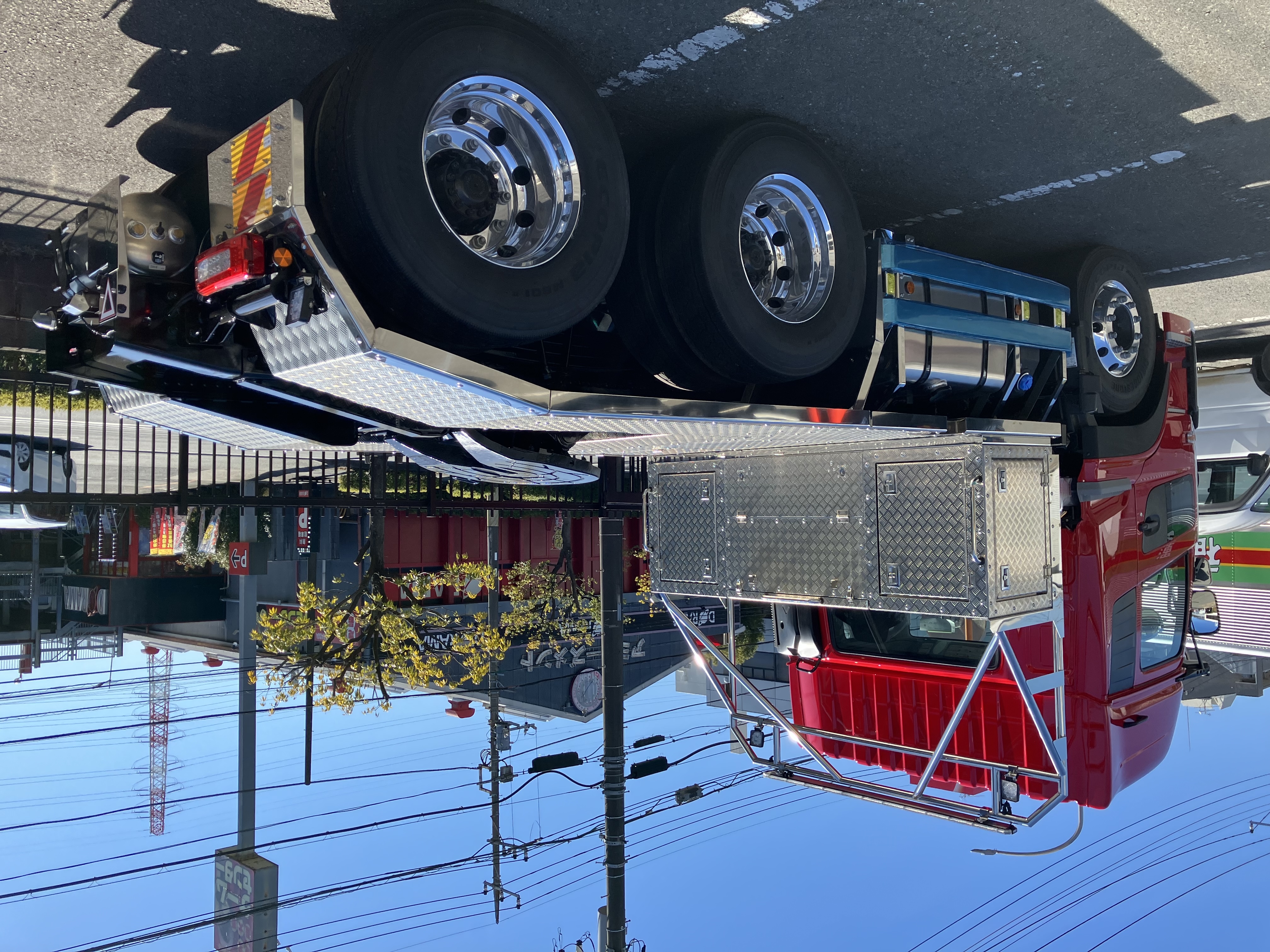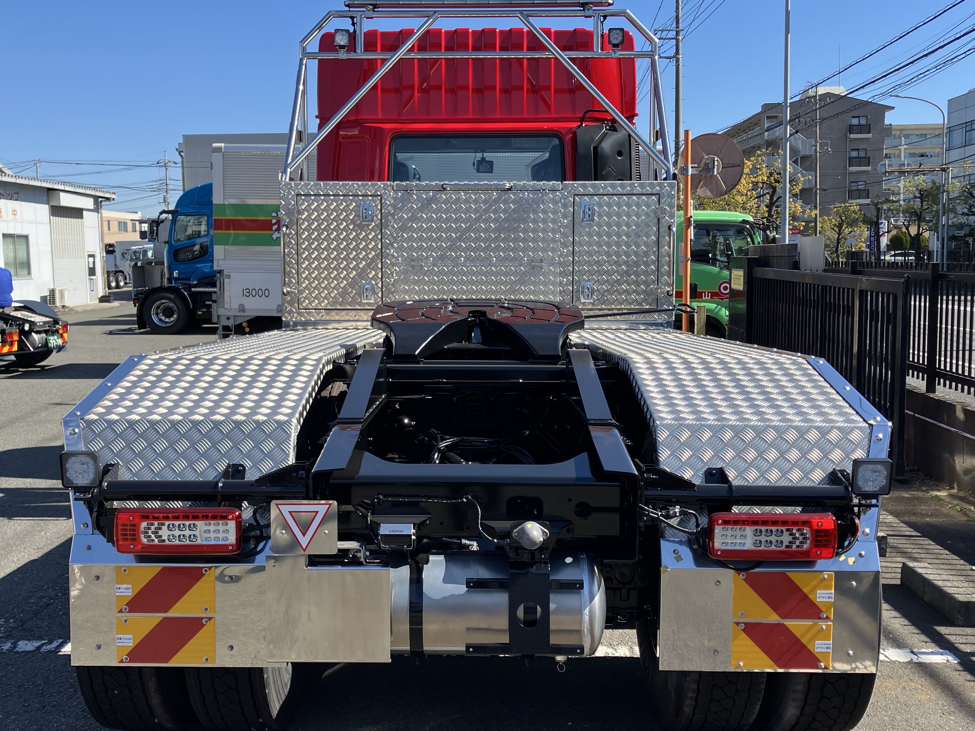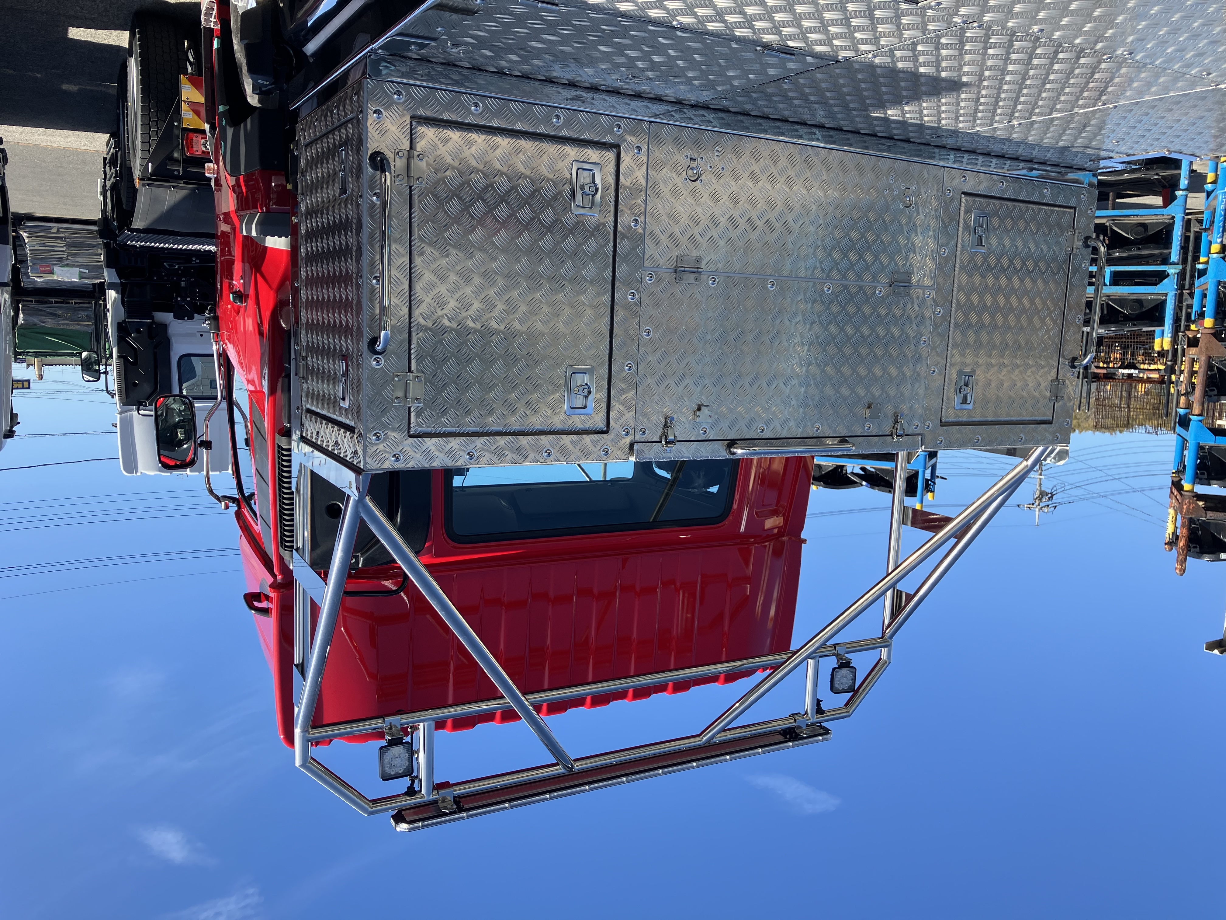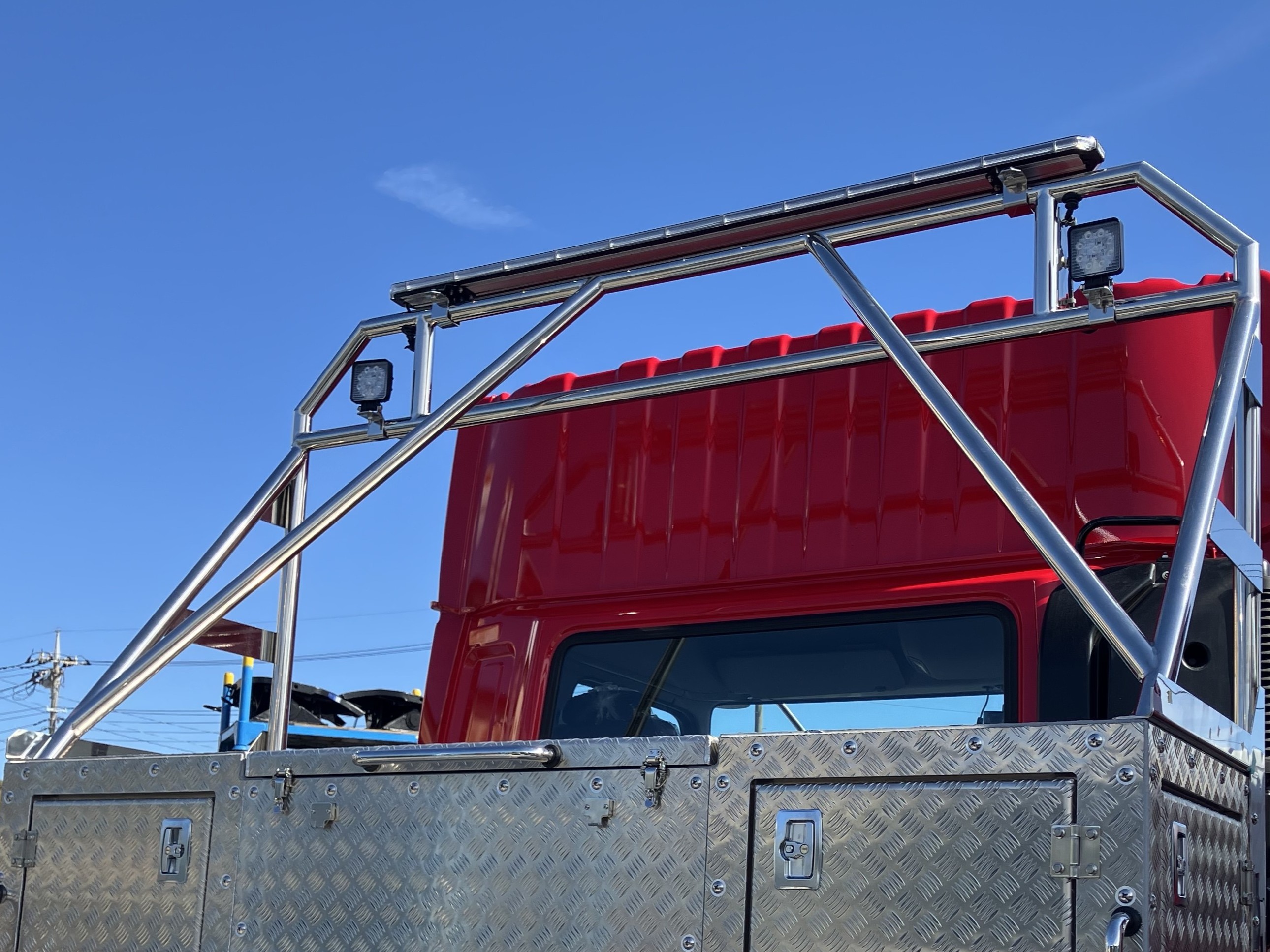 また、フェンダや全面踊場、サイドガードなどの各部にも防錆性と耐久性を考慮した施工を施し、工具箱上面には回転灯取付用のロールバー風ステンレスブラケットを設置することで、機能性とデザイン性を兼ね備えた外観を完成させました。