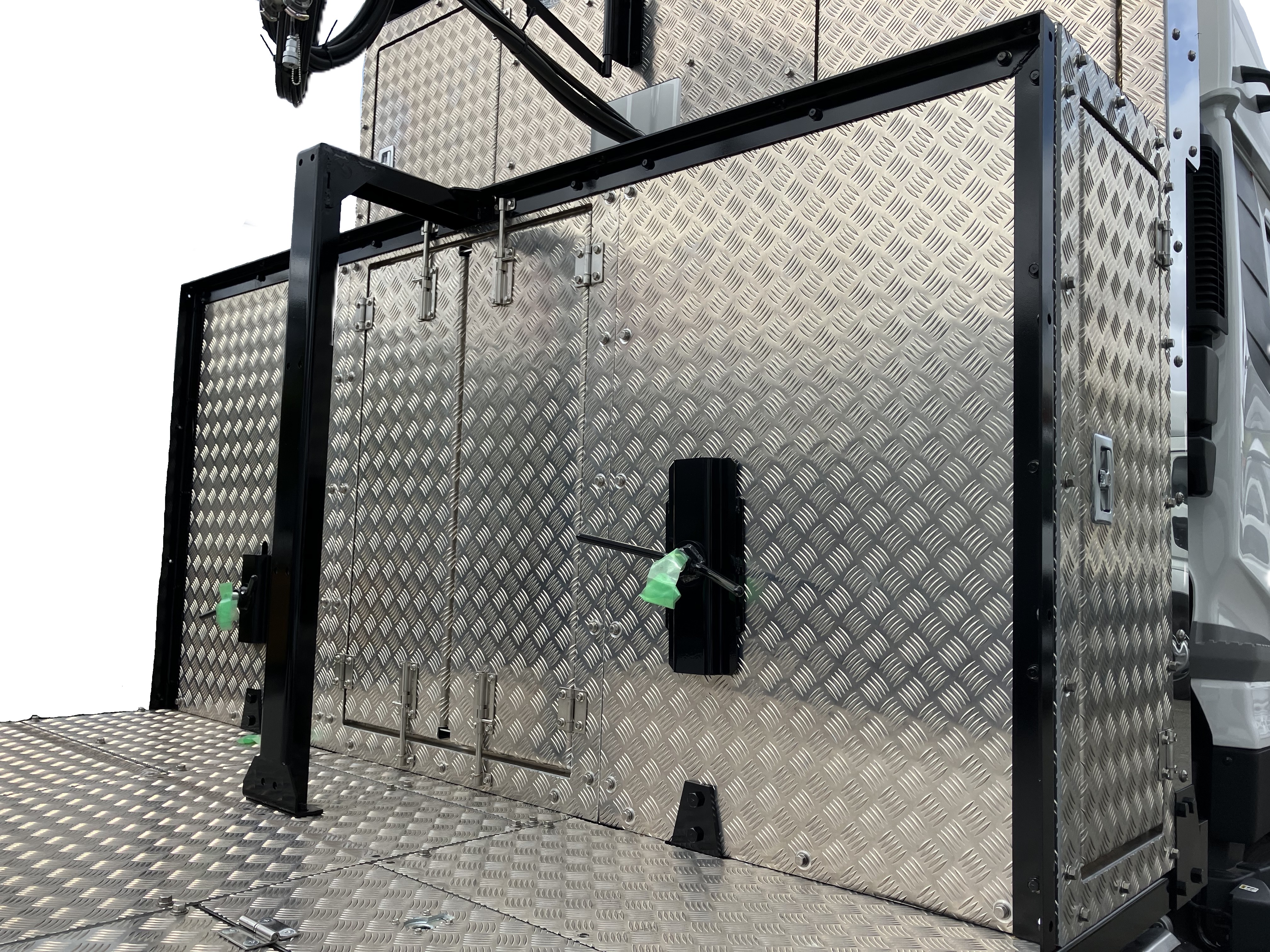 カバー装着後は、アルミ縞板による保護と美観の向上が図られています。カバーの上面端と後面端にはグリップを取り付けており、さらに、カバー後面には昇降用ステップも設置、プロテクタの物入れにもアクセスしやすいように製作いたしました。