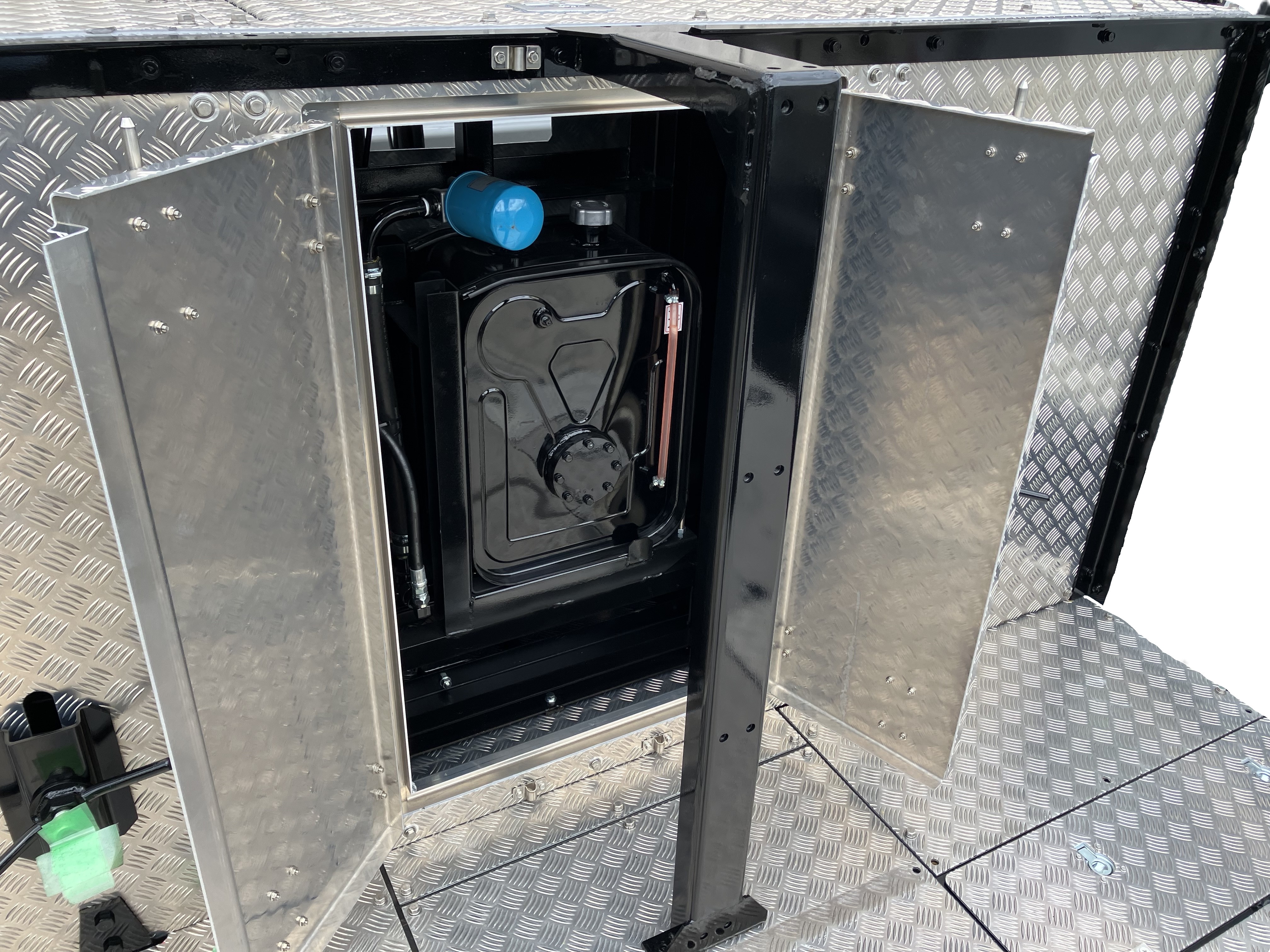 トレーラ用の油圧装置は、工具箱中央部に収納されています。工具箱内に専用スペースを設けることで、外部への露出を避け、装置の保護と美観を高める設計となっています。