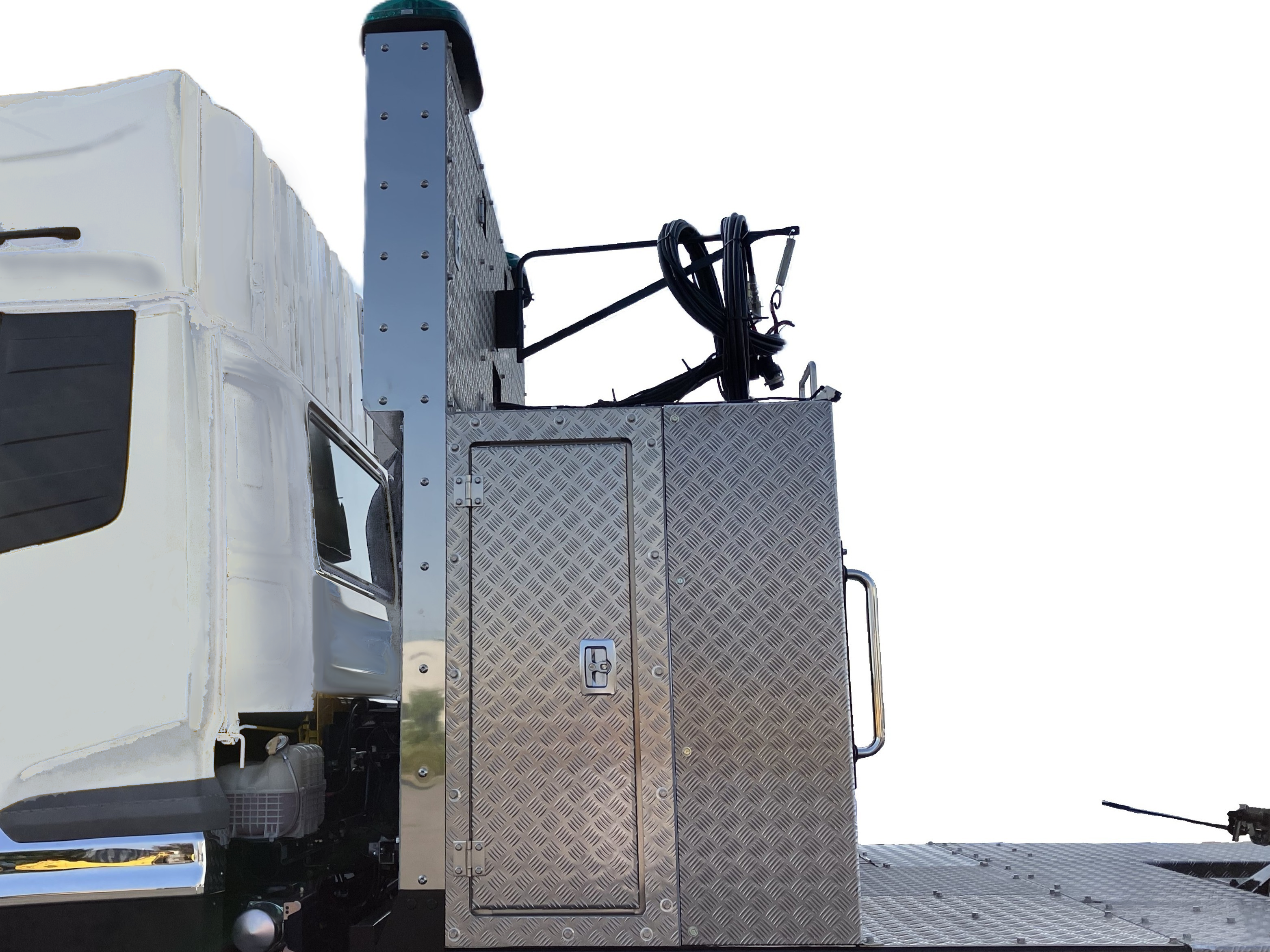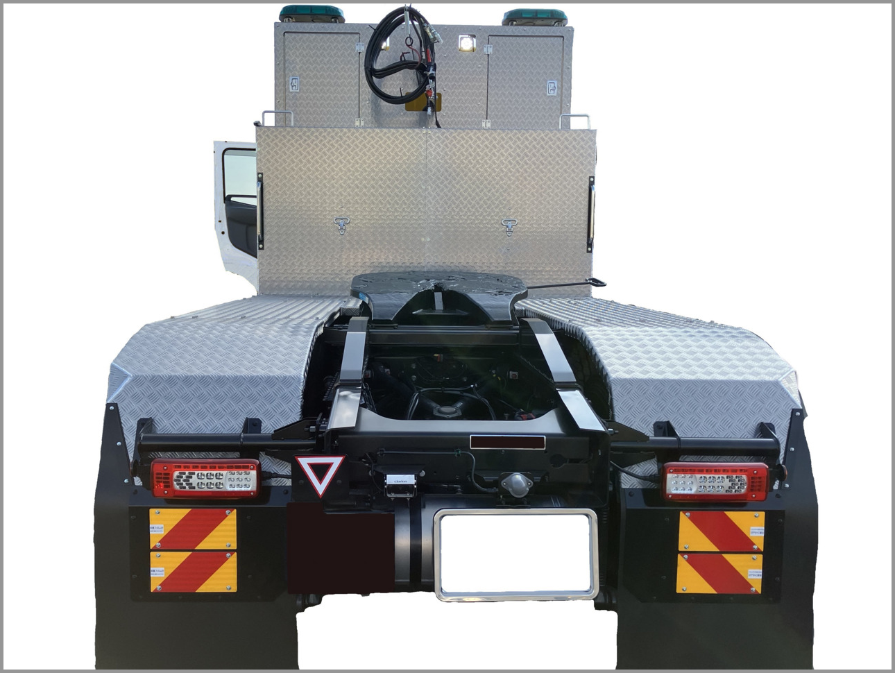 本トラクタは、作業効率と収納力の両立を目的に、工具箱の設計に重点を置いた架装を施しています。工具箱側面に扉を設け、内部スペースを有効に活用することで、中央部にはトレーラ用の油圧装置を収納し、整備性と保護性を兼ね備えた設計としています。さらに、工具箱後面にはスペアタイヤキャリアを設置し、トラクタヘッド用とトレーラ用の異なるサイズのタイヤを収納可能な構造としています。その上からアルミ縞板製のカバーを取り付けることで、タイヤの保護と美観を両立。限られたスペースの中で、収納機能と整備性、安全性を高いレベルで融合させた架装となっています。