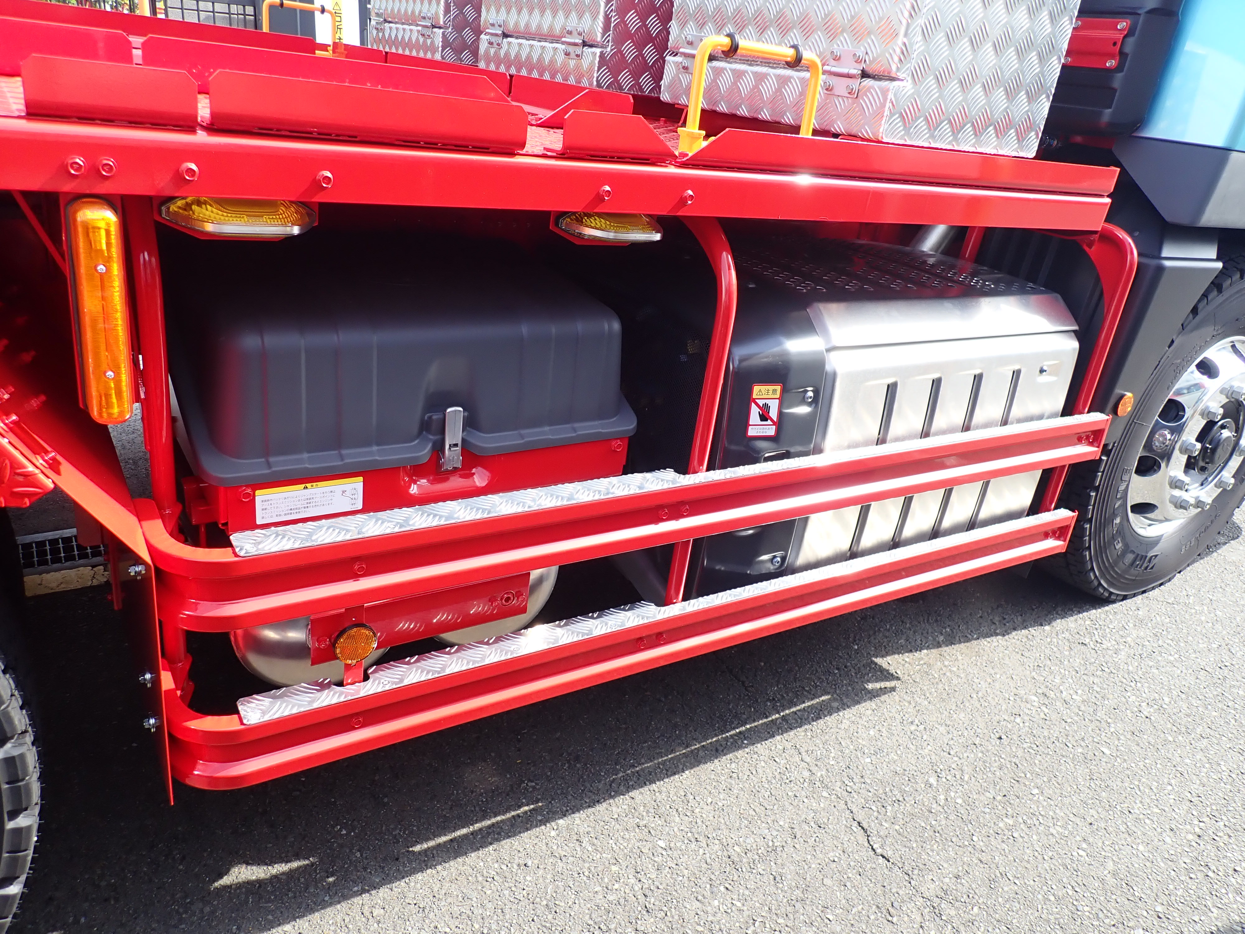 サイドガードにはアルミ縞板製のステップを設置、夜間走行を考慮して、サイドガード周辺には大型のアンダーライトも同時に設置し、安全性を確保しています。