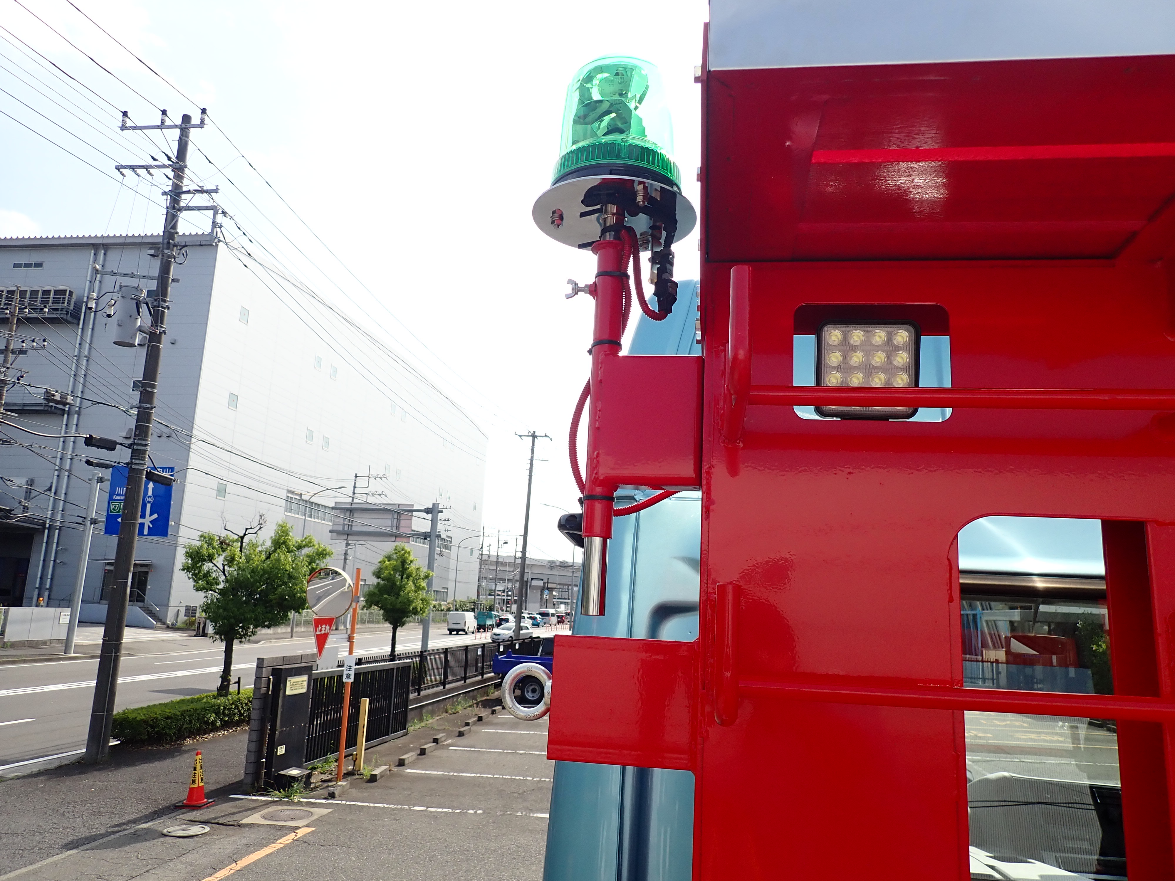 視認性・安全性・法規対応を考慮し、プロテクタ内に作業灯、側面に回転灯を設置しています。