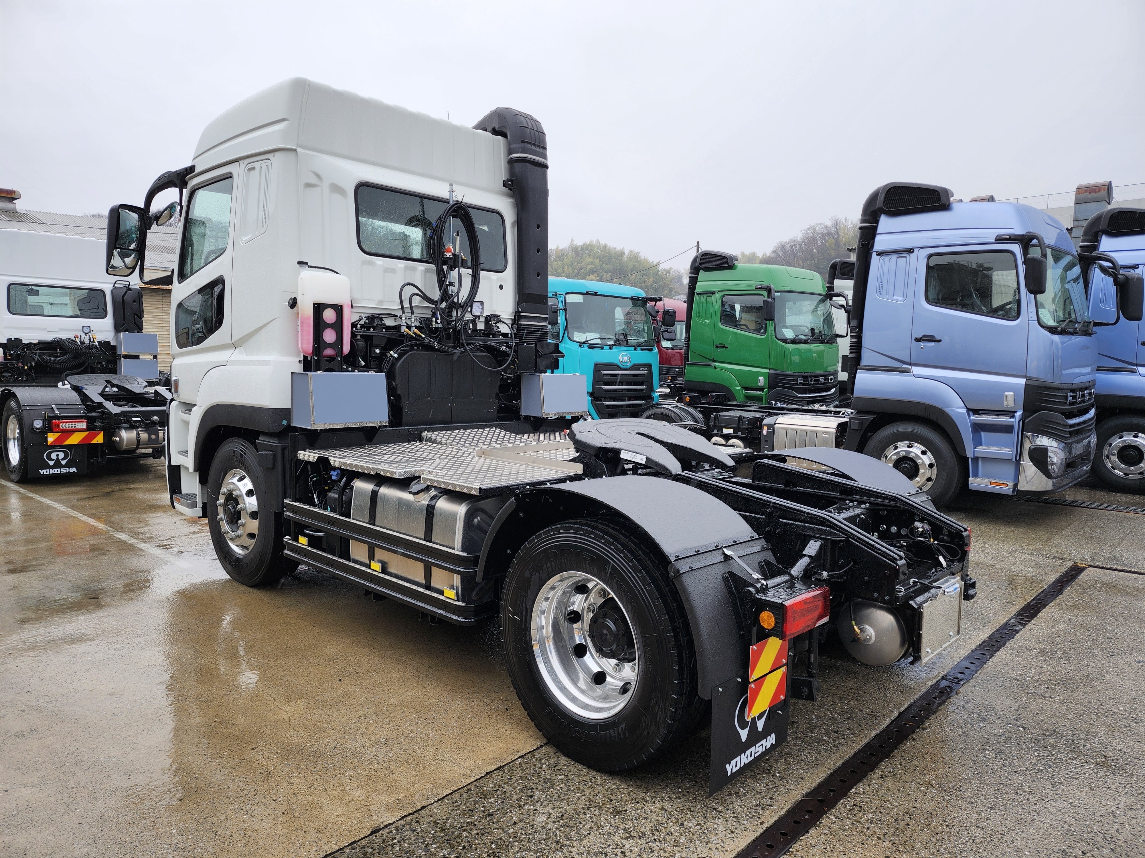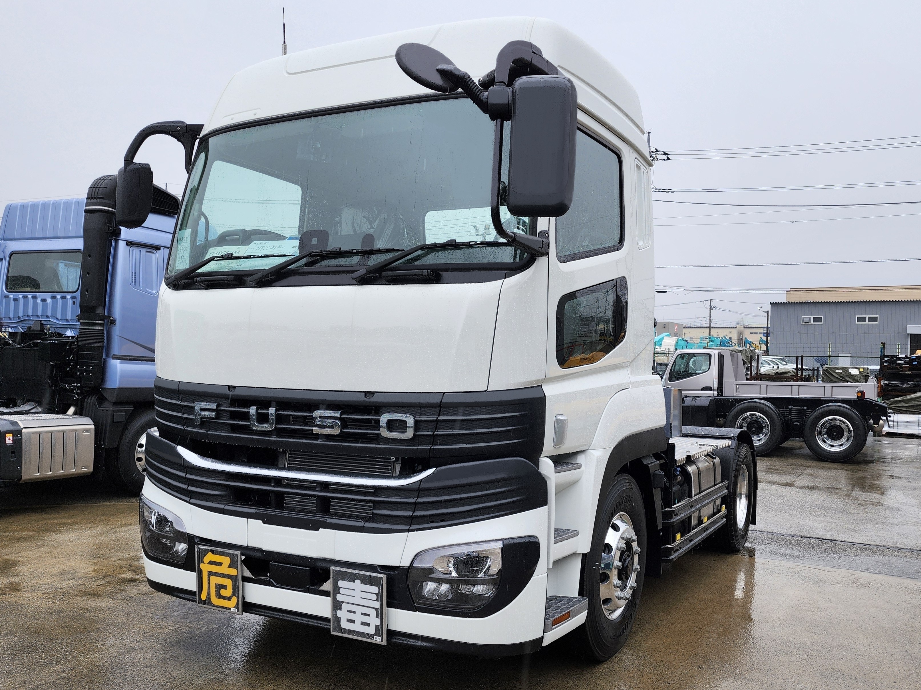危険物運搬に対応したトラクタとして、「危」「毒」の表示板を着脱できる枠で装備し、運用内容に合わせて掲示を切り替えられる仕様です。足元は滑りにくいアルミ縞板で仕上げ、安全性と耐久性を向上。サイドガードにはアルミステップを取り付け、滑り止め効果に加えて外観も引き締めています。左右の工具箱に加え、車輪止めを常備できるようにし、さらに高さ検知棒を取り付けることで納入先での安全性を確保。複数のセミトレーラーを付け替えて運用できる汎用性も備えています。