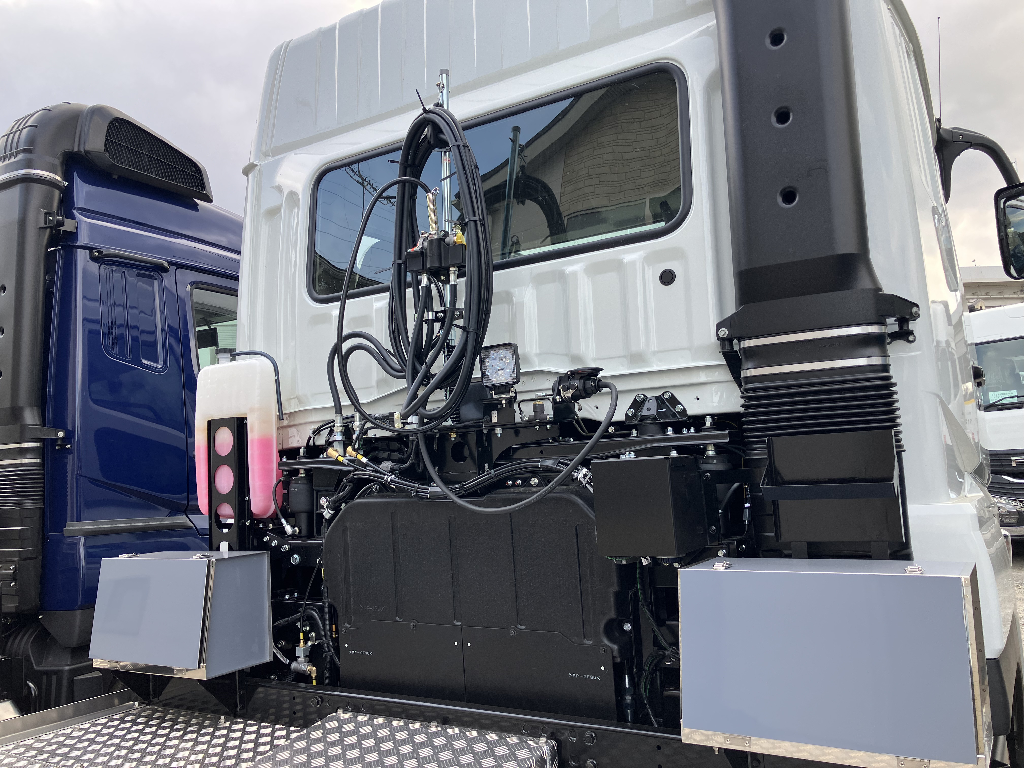 ケーブルホースを設置することで、ホース類がシャシへ接地することを防止。また、両端に工具箱を設けることで、作業時の利便性向上を図っています。