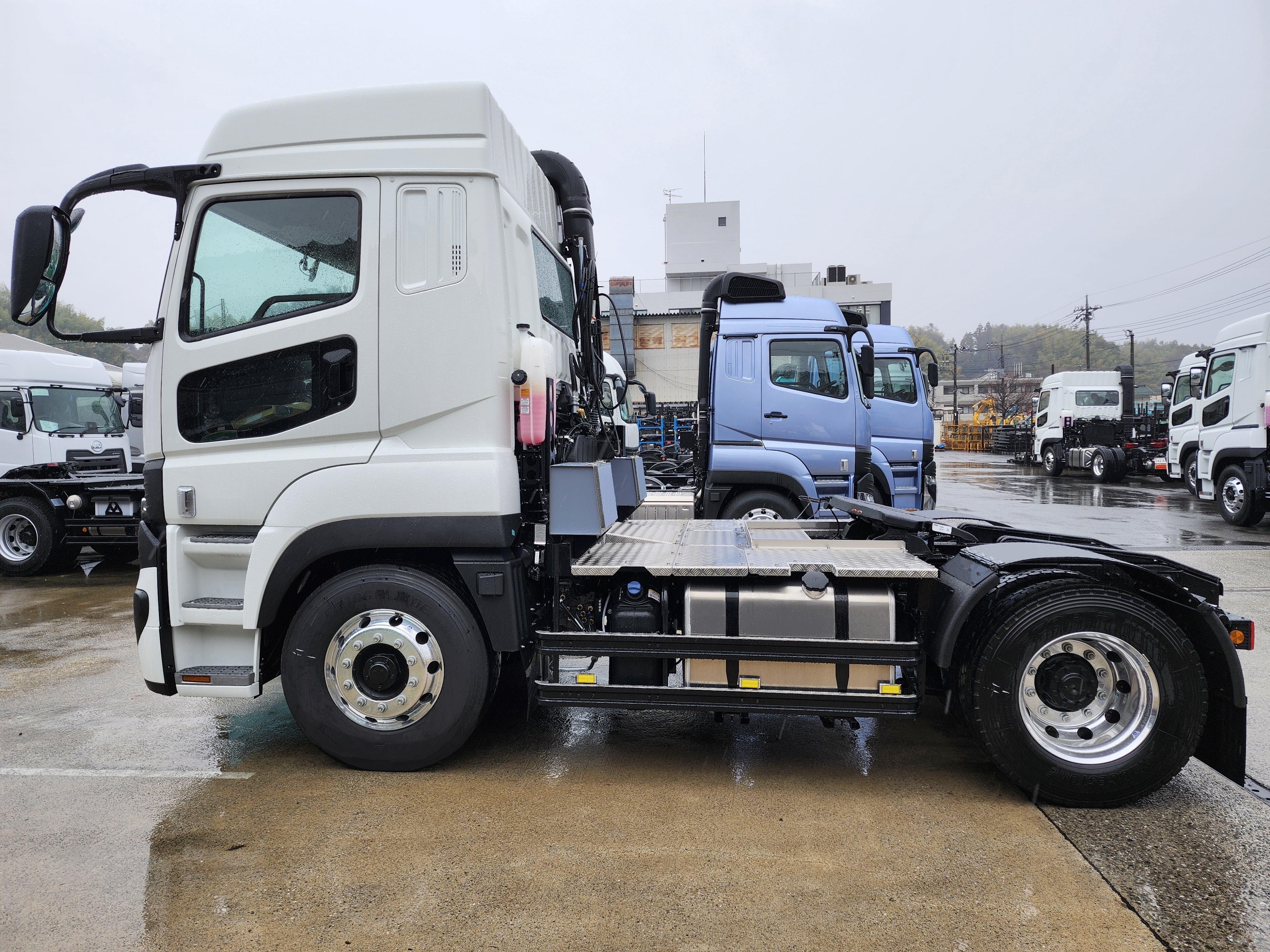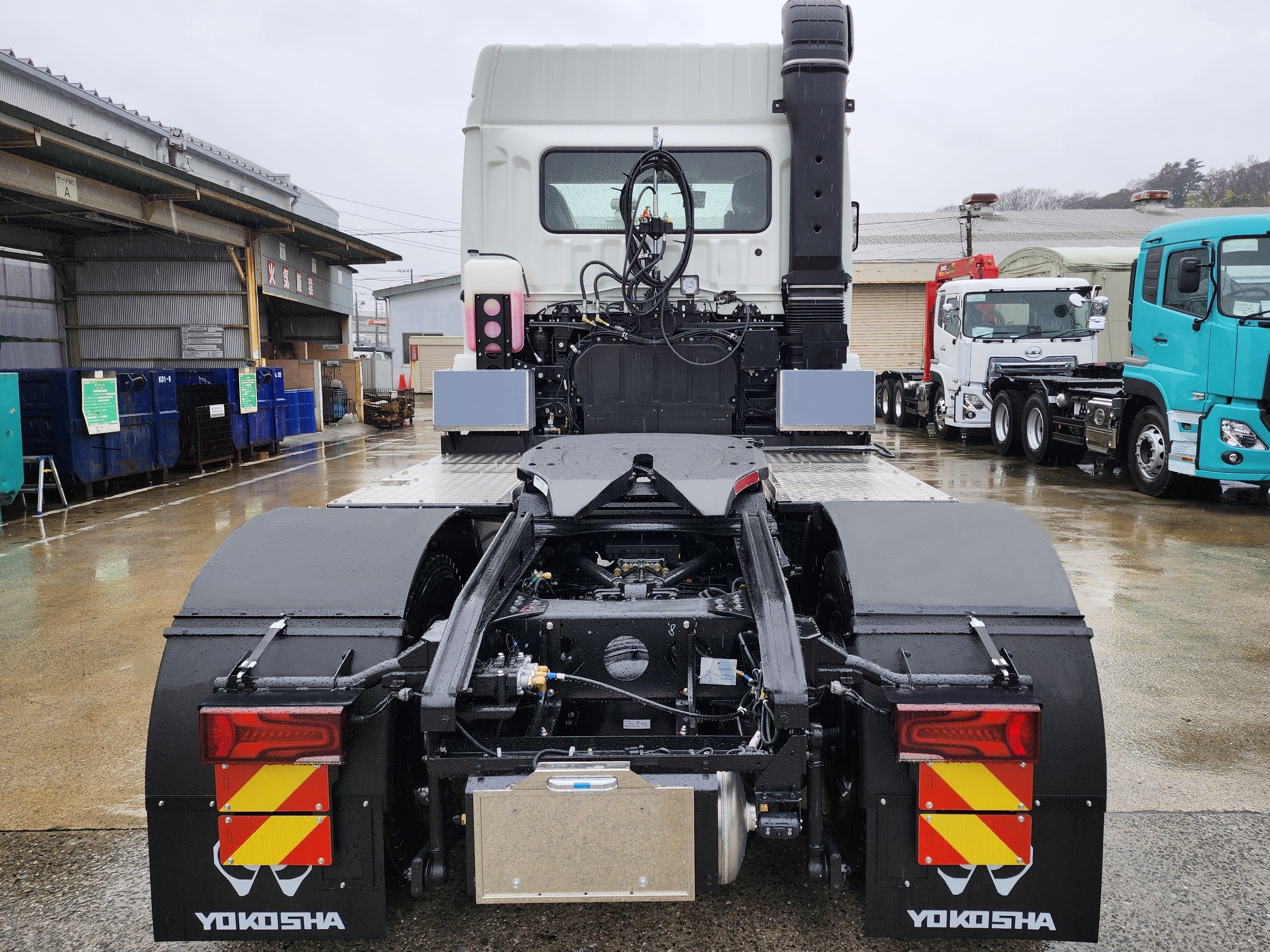 危険物運搬に対応したトラクタとして、「危」「毒」の表示板を着脱できる枠で装備し、運用内容に合わせて掲示を切り替えられる仕様です。足元は滑りにくいアルミ縞板で仕上げ、安全性と耐久性を向上。サイドガードにはアルミステップを取り付け、滑り止め効果に加えて外観も引き締めています。左右の工具箱に加え、車輪止めを常備できるようにし、さらに高さ検知棒を取り付けることで納入先での安全性を確保。複数のセミトレーラーを付け替えて運用できる汎用性も備えています。