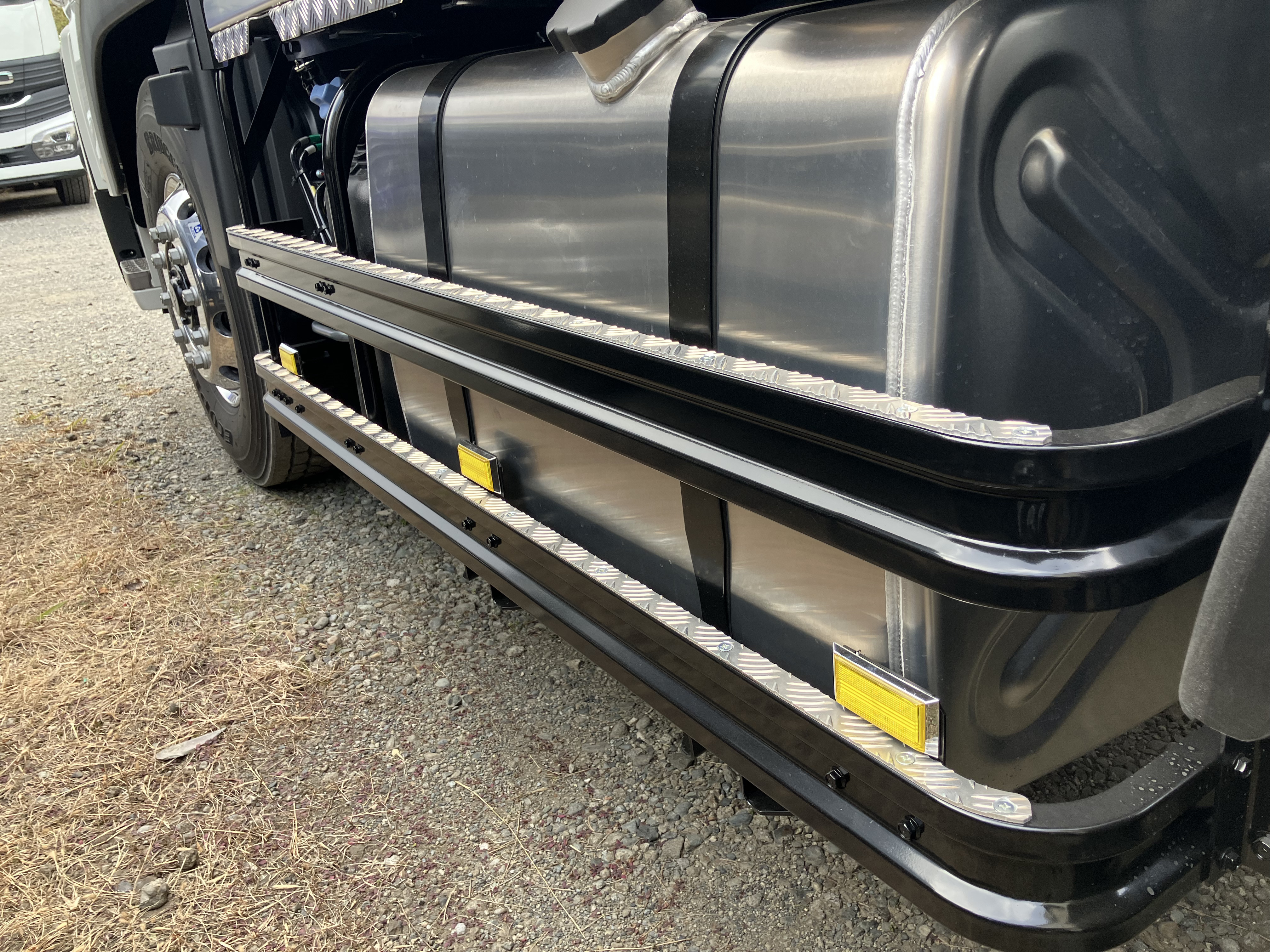 サイドガードにはアルミ縞板を取り付け、滑り止め効果を高めるとともに、外観の向上を図っています。